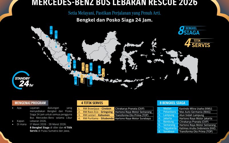 Mendukung kenayamanan periode mudik Lebaran 2026, PT Daimler Commercial Vehicles Indonesia (DCVI) menyiapkan program Mercedes-Benz Bus Lebaran Rescue 2026 dengan total 12 titik layanan di jalur transportasi utama Indonesia.
