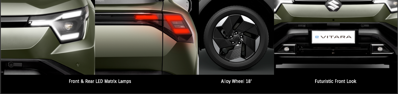 Tampilan eksterior e VITARA merepresentasikan konsep ‘Metal Beast’ dengan memadukan arsitektur polygonal untuk mengekspresikan kecanggihan sekaligus ketangguhan SUV kekinian.